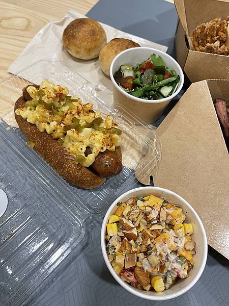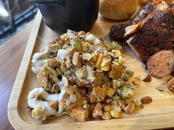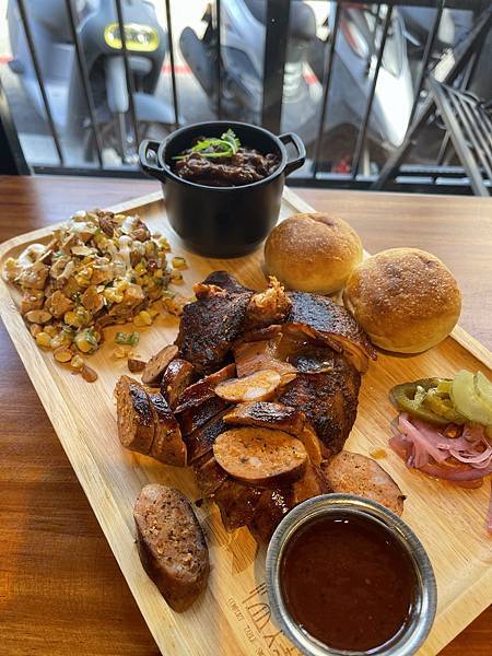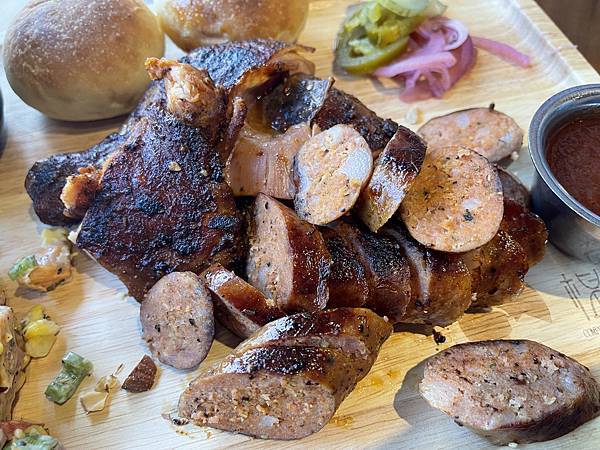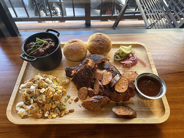 這天點了自製美式香腸、煙燻雞腿排和手撕豬熱壓三明治,配菜是BBQ焗豆和墨西哥甜薯玉米沙拉,並附上兩個軟法餐包,這畫面實在太美太令人心醉了啦~要注意的是如果點柴燒煙燻燒肉,一份肉需搭配兩份配菜並附贈一個軟法餐包,全份豬肋排和牛肋排視同兩份肉喔!