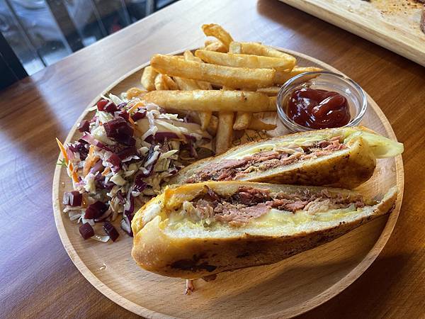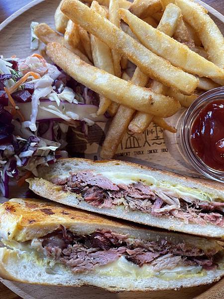 南方風味手撕豬+艾曼塔起司,用酸黃瓜和輔佐,整體吃起來豐富又討喜!旁邊給的薯條和沙拉量也很澎湃,都是這個份量太大讓我覺得整個點下來有點過飽XDDD(所以是要怪別人了喔